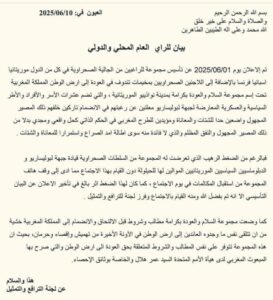 وختم البيان بالتأكيد على أن العودة إلى أرض الوطن هي السبيل الوحيد لإنهاء معاناة آلاف الصحراويين، وطي صفحة التشتت والانقسام، والانخراط الفعلي في مسيرة تنمية الأقاليم الجنوبية للمملكة المغربية.