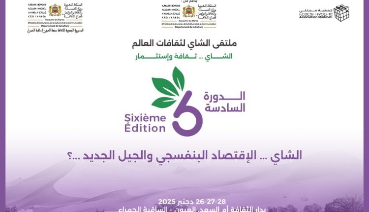 تستعد مدينة العيون لاحتضان فعاليات الدورة السادسة من “ملتقى الشاي لثقافات العالم”، الذي تنظمه جمعية مدينتي بدعم من وزارة الشباب والثقافة والتواصل – قطاع الثقافة، وبتنسيق مع المديرية الجهوية للثقافة بالعيون، وبالتعاون مع مكتب تنمية التعاون، وبشراكة مع وكالة أسفار أطهر الديار، وذلك أيام 26 و27 و28 دجنبر 2025، بدار الثقافة أم السعد.