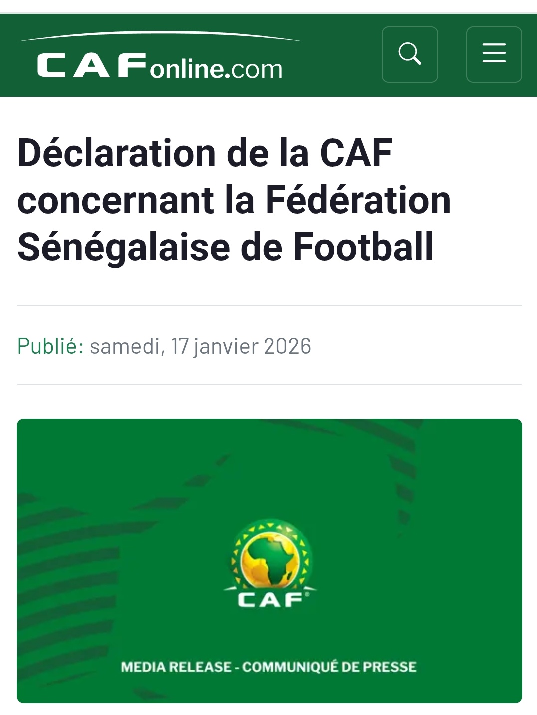 أصدر الاتحاد الإفريقي لكرة القدم (CAF)، يوم السبت 17 يناير 2026، بياناً رسمياً بخصوص التصريحات المنسوبة إلى الجامعة السنغالية لكرة القدم، والمتعلقة بالجوانب اللوجستية لتحضيرات المنتخب السنغالي قبل نهائي كأس أمم إفريقيا “توتال إنيرجيز – المغرب 2025”.