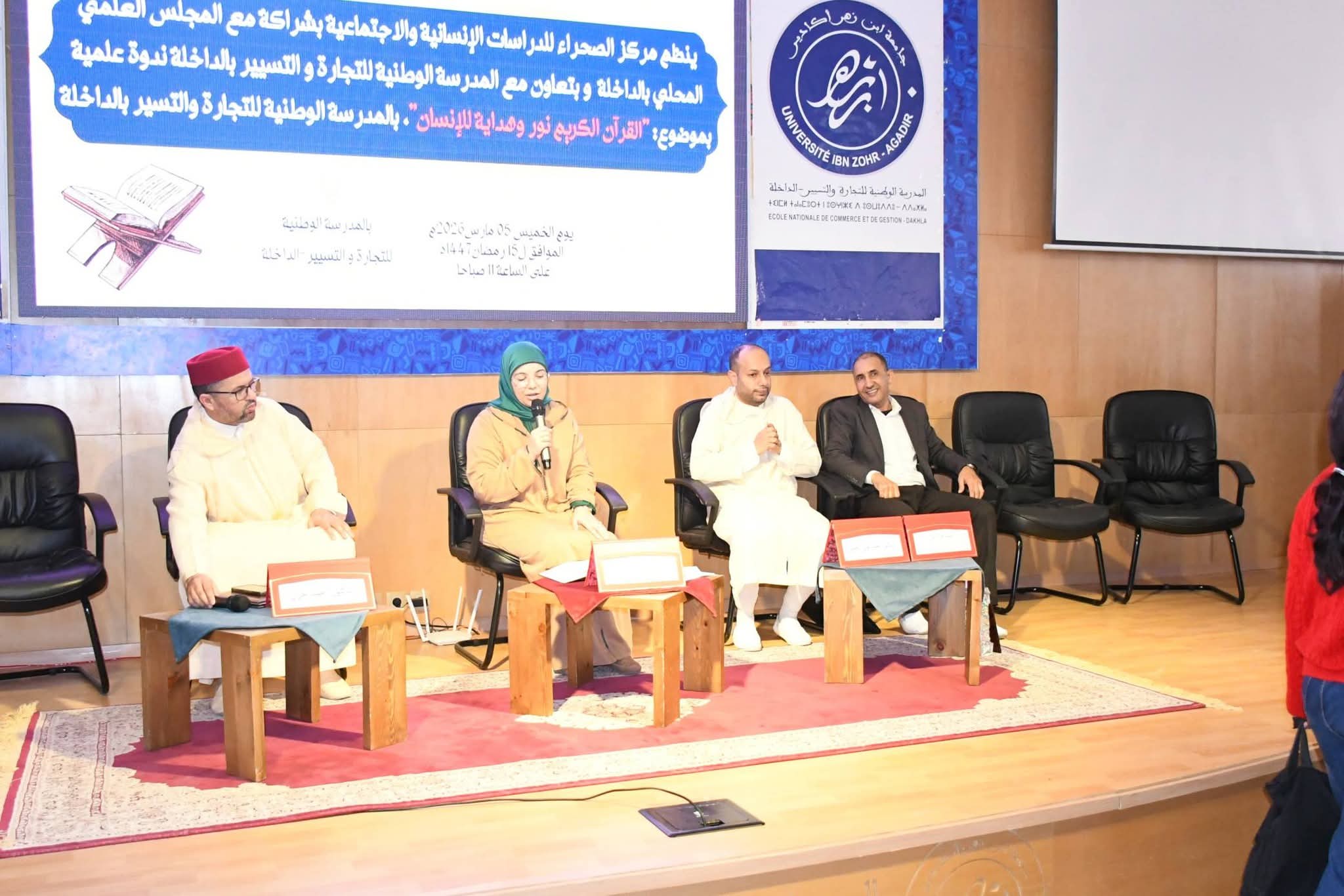 نظم مركز الصحراء للدراسات الإنسانية والاجتماعية، بالتعاون مع المجلس العلمي المحلي بمدينة الداخلة والمدرسة الوطنية للتجارة والتسيير، ندوة علمية حول دور القرآن الكريم في تعزيز القيم الدينية وبناء الإنسان. وتسعى هذه الندوة التي احتضنتها المدرسة الوطنية للتجارة والتسيير إلى إعادة مساءلة الخطاب القرآني في أبعاده المعرفية والأنثروبولوجية، واستجلاء دلالاته المقاصدية وصلتها ببناء الإنسان وتوجيه الفعل الحضاري.
