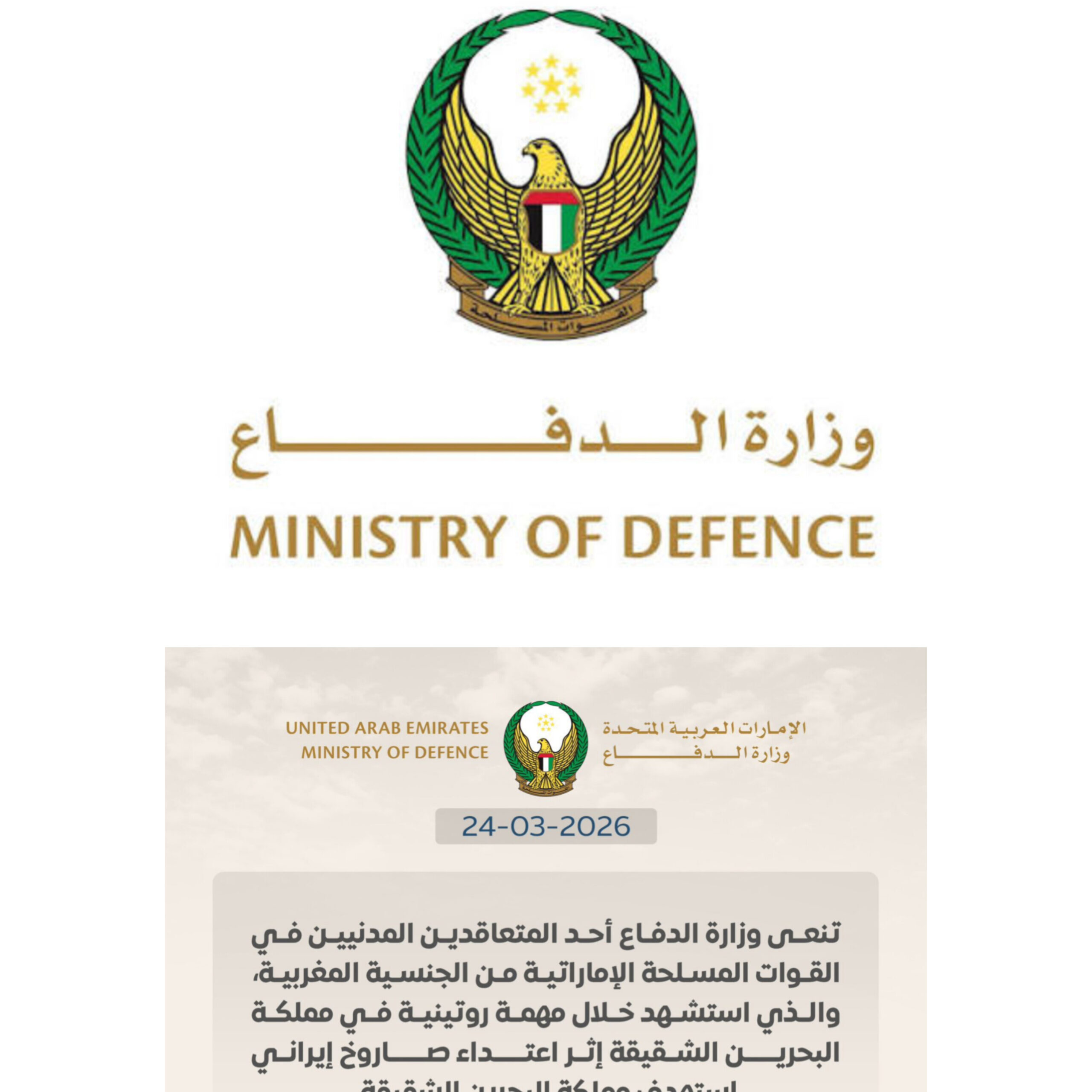 أصدرت وزارة الدفاع بدولة الإمارات العربية المتحدة بيانا رسميا اليوم، الثلاثاء 24 مارس 2026، تنعى فيه أحد المتعاقدين المدنيين العاملين في القوات المسلحة الإماراتية، وهو من الجنسية المغربية، والذي وافته المنية خلال أداء مهمة روتينية في مملكة البحرين.